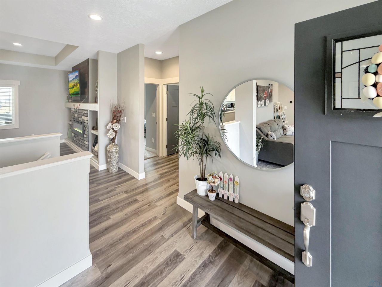 Beautiful custom ranch home in the Blackhawk Ridge addition in Hinton offering over 4,000 finished sq ft, 5 bedrooms, 3 bathrooms, plus a home office and gym. The open-concept main level features a spacious kitchen with granite countertops, large island with seating for 5+, abundant cabinetry, gas stove, hidden walk-in pantry, and brand-new refrigerator. Dining area with sliders leads to a covered deck with hot tub that stays, overlooking beautiful views with no backyard neighbors. The primary suite includes a spa-inspired tile shower with dual shower heads, built-in bench, and granite vanity. Custom built-in entertainment centers highlight both the main living room and finished basement, which also features theater seating, wet bar, and home gym. Two large basement bedrooms offer spacious walk-in closets. Additional features include extra wide basement staircase, mudroom with built-in bench and laundry, solid core doors throughout, oversized 3 stall garage, in-ground trampoline, and new roof, fascia, and garage doors. All appliances stay except garage freezers. Washer and dryer less than a year old. Built in 2020, this home sits on a large lot with incredible views.